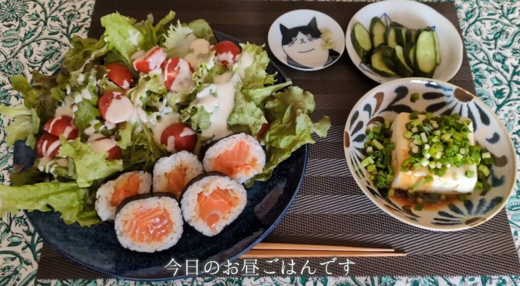 今日のメインは、サーモンポキロールというサーモンの海苔巻きのようなものです。