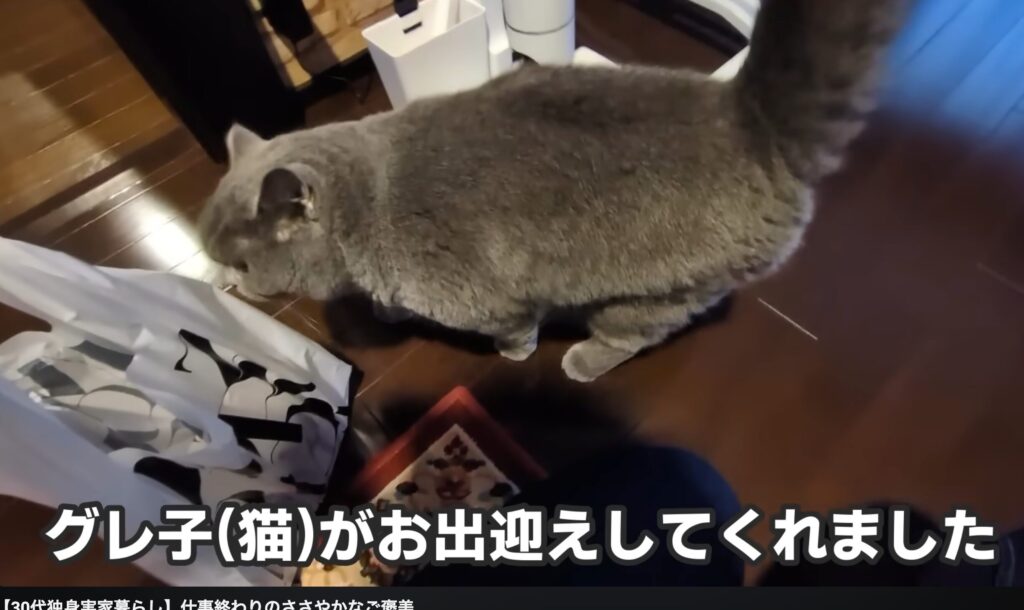 こんにちは、ぼっちごはんです。仕事から帰宅して、愛猫グレ子と一緒に過ごす夜の時間をご紹介します。