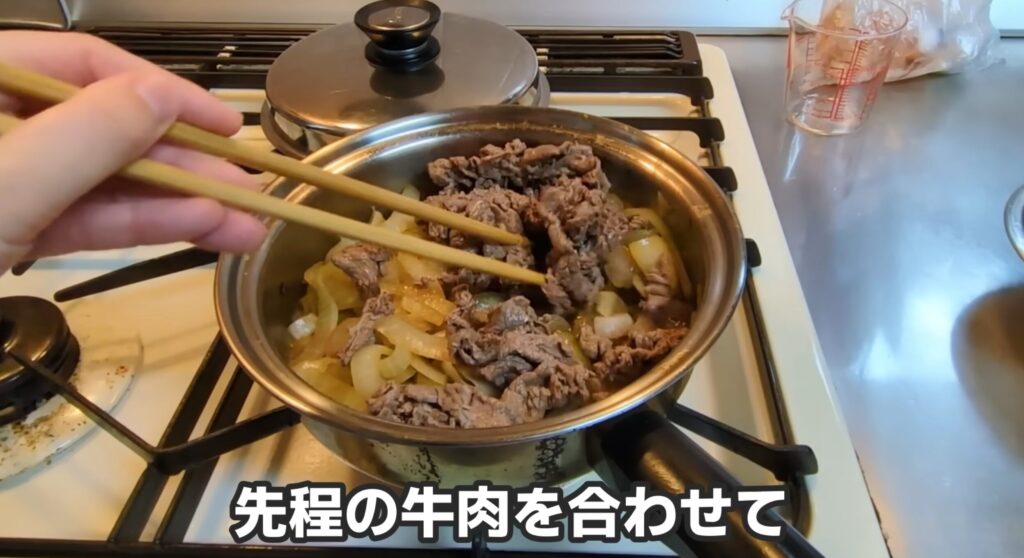 玉ねぎが柔らかく煮えたら、先程の牛肉を合わせます。