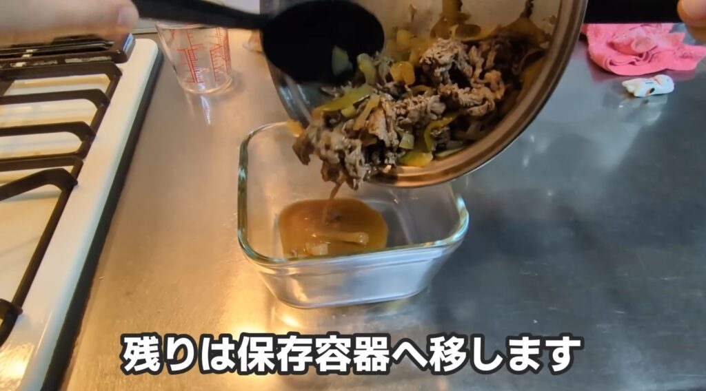食事を終えたら、残った牛丼を保存容器へ移します。