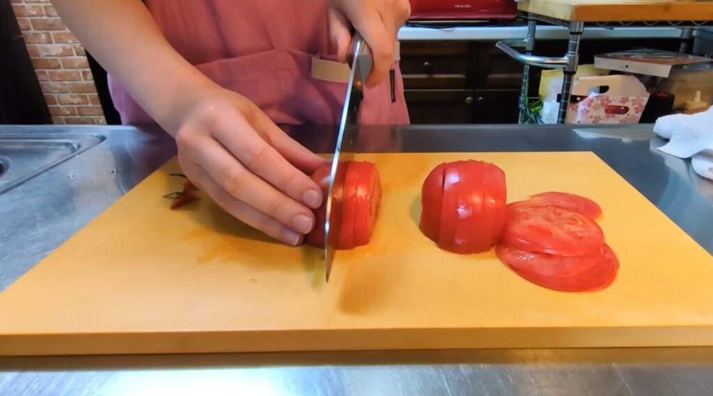 新しい包丁が届いたら、まず試したくなるのが、やっぱりトマトですよね。薄くスライスしてみます。