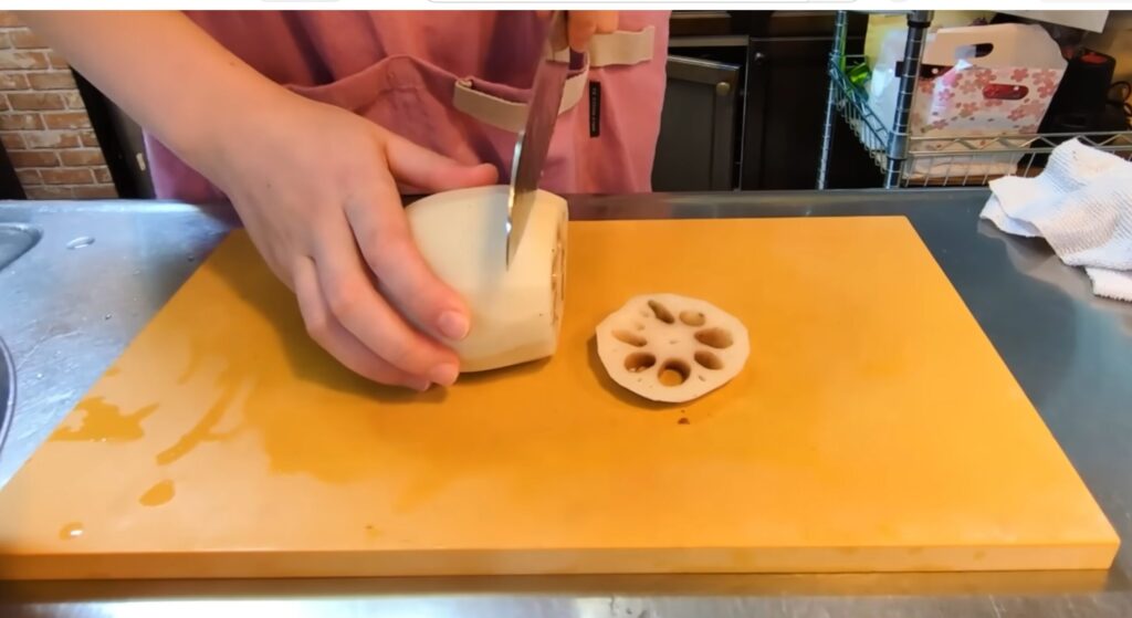 レンコンが白くきれいに仕上がります。せっかく新しい包丁なので、今日はレンコンをお花の形にします。