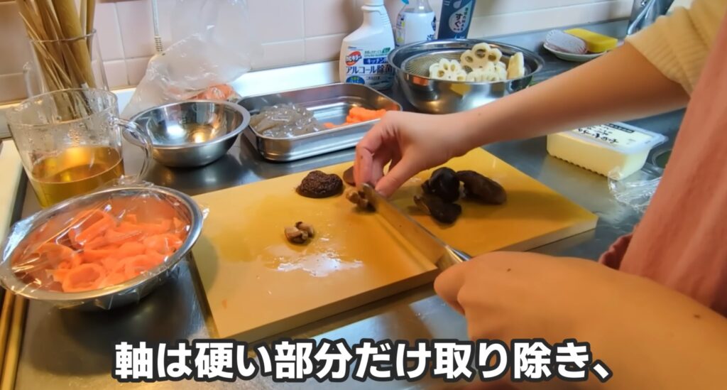 筑前煮には傘だけ使います。お味噌汁の準備もします。